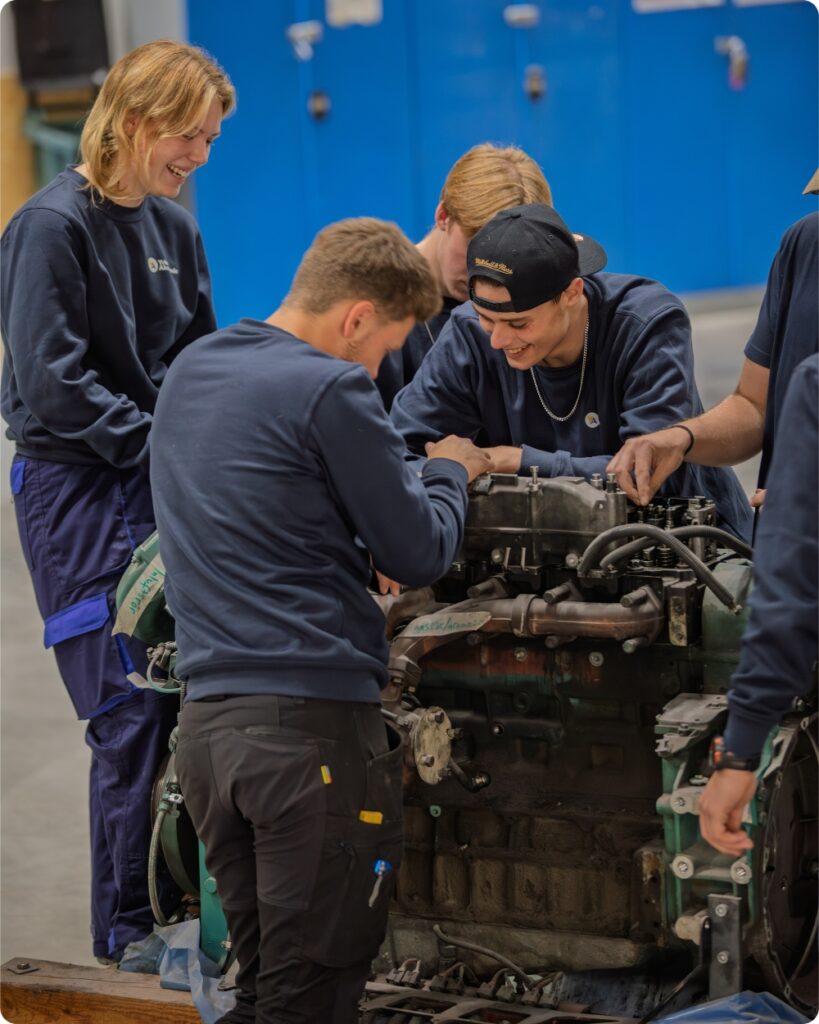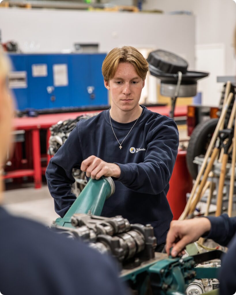 – Först har vi det teoretiska – vi läser, testar och ser till att vi förstår. Sen går vi ut i verkstaden och gör det i praktiken. Det gör att man redan vet vad man ska titta efter och tänka på.